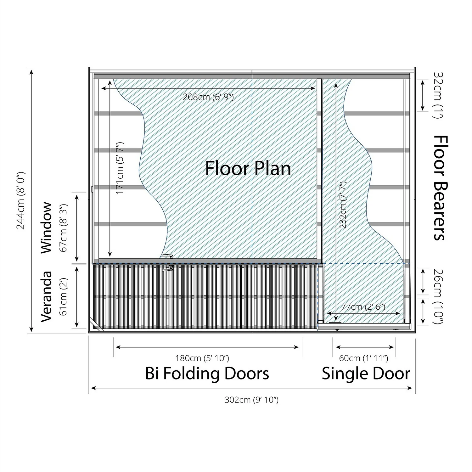 Featuring bi-folding doors and an elegant veranda, this building is great for those looking for somewhere stylish to relax, unwind and enjoy uninterrupted views of the garden with the benefit of an additional storage area. Premium tongue and groove boards make up the walls, floor and roof of this premium summerhouse. Complete with thick wooden framing to support the cladding internally, this building offers a rigid and long-lasting structure perfect for years of enjoyment.