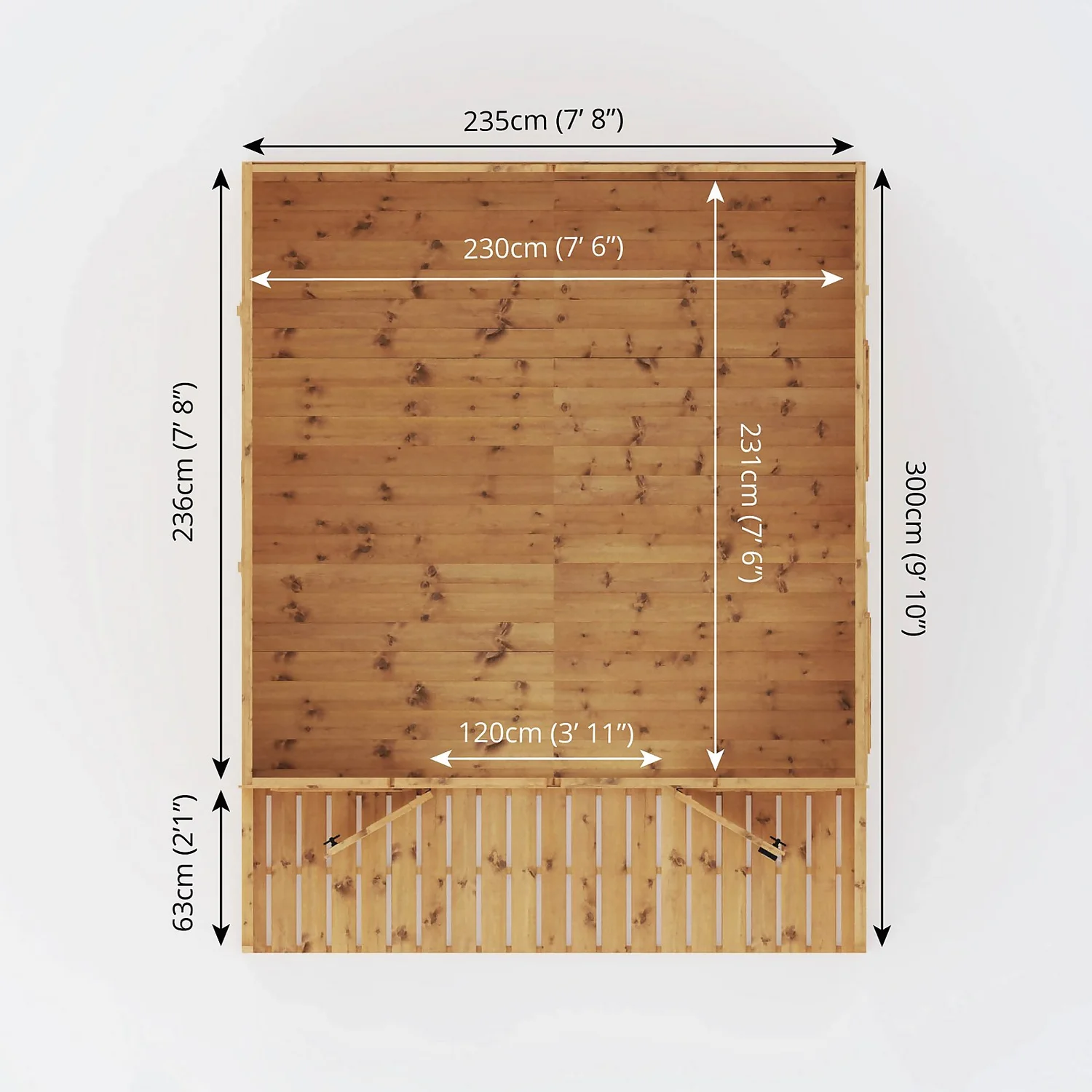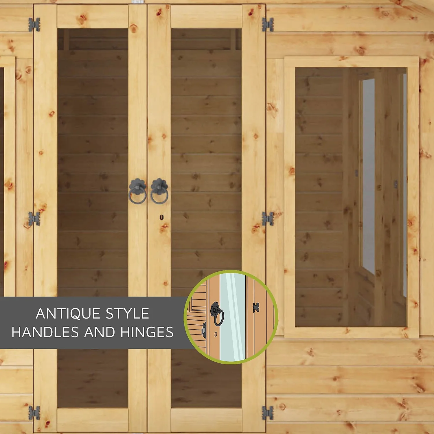 The tuxford is a spacious and stylish summerhouse that offers the perfect spot to sit back and relax during the summer months. Four large styrene glazed windows allow light to flood the interior and styrene glazed French doors open out onto the sheltered veranda, creating a light, airy and welcoming space to enjoy. The walls, roof and floor are constructed from premium tongue and groove cladding. Complete with thick wooden framing to support the cladding internally, this building offers a rigid and long-lasting structure, for you to enjoy for many years to come.