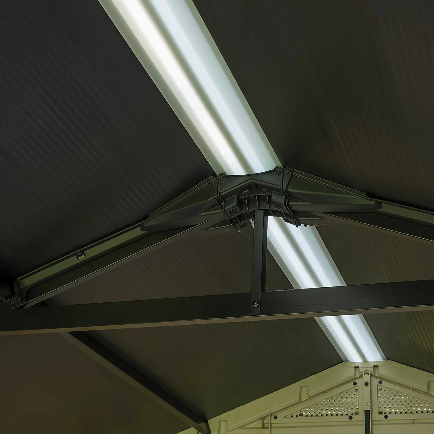 This elegant outdoor garden shed makes storing just about anything simple and elegant. The Keter 8 x 11 large apex shed is made out of a durable and weather-resistant resin that has a fine wood-like texture for looks and incorporates steel reinforcement for sturdiness. This shed is ventilated and comes with a window and skylight to allow plenty of natural light. The 11 x 8 has a heavy-duty floor – ideal for storing heavy items such as lawnmower and ATVs, a high ceiling that lets you move around with ease and wide double doors making it easy to enter and access everything you need. This shed is lockable (lock not included) and includes two shelves and is easy to assemble. Shed Footprint: 248 x 326 cm