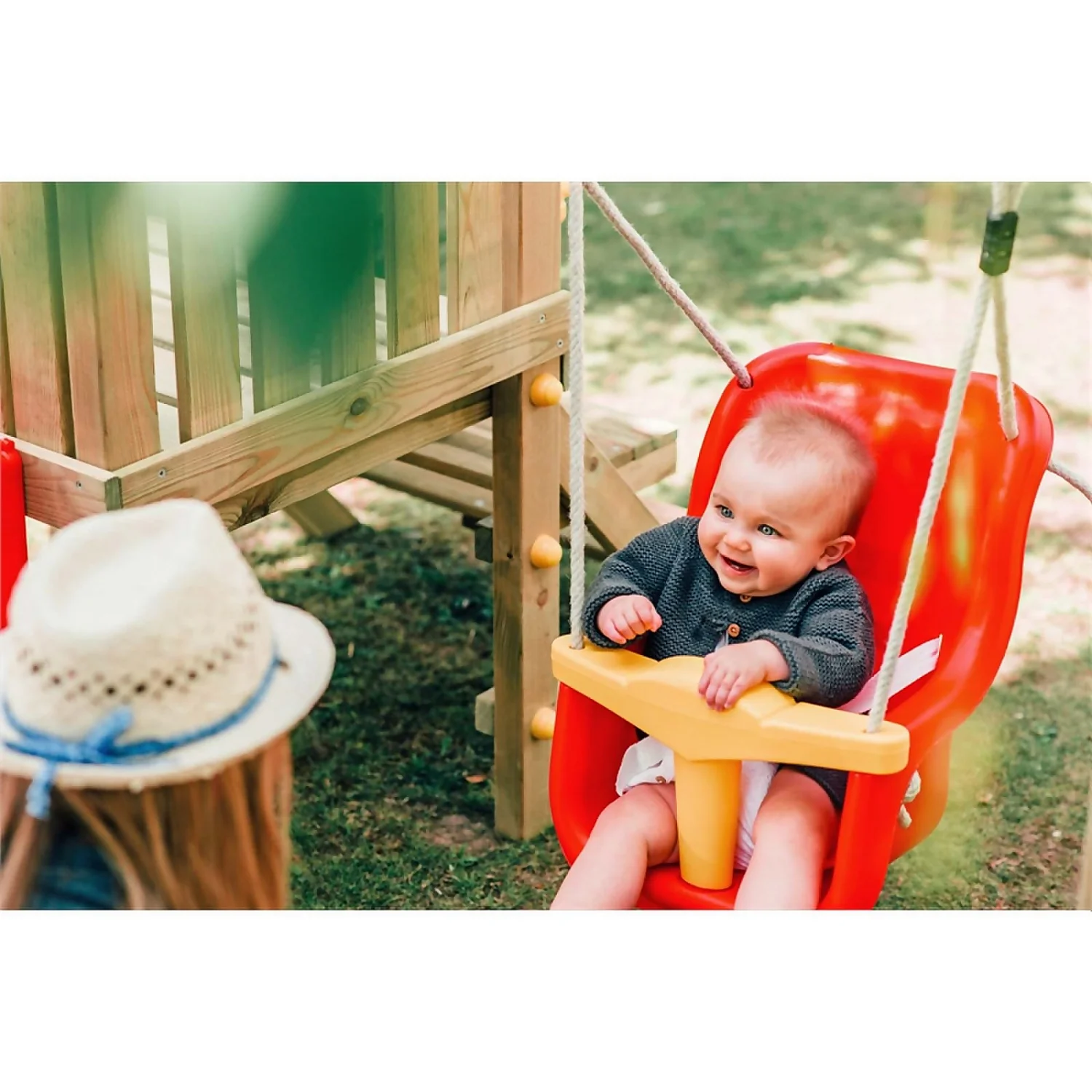 - Play set includes: Play deck with wooden steps and 4ft wave slide, colourful accessories, swing arm with baby swing seat