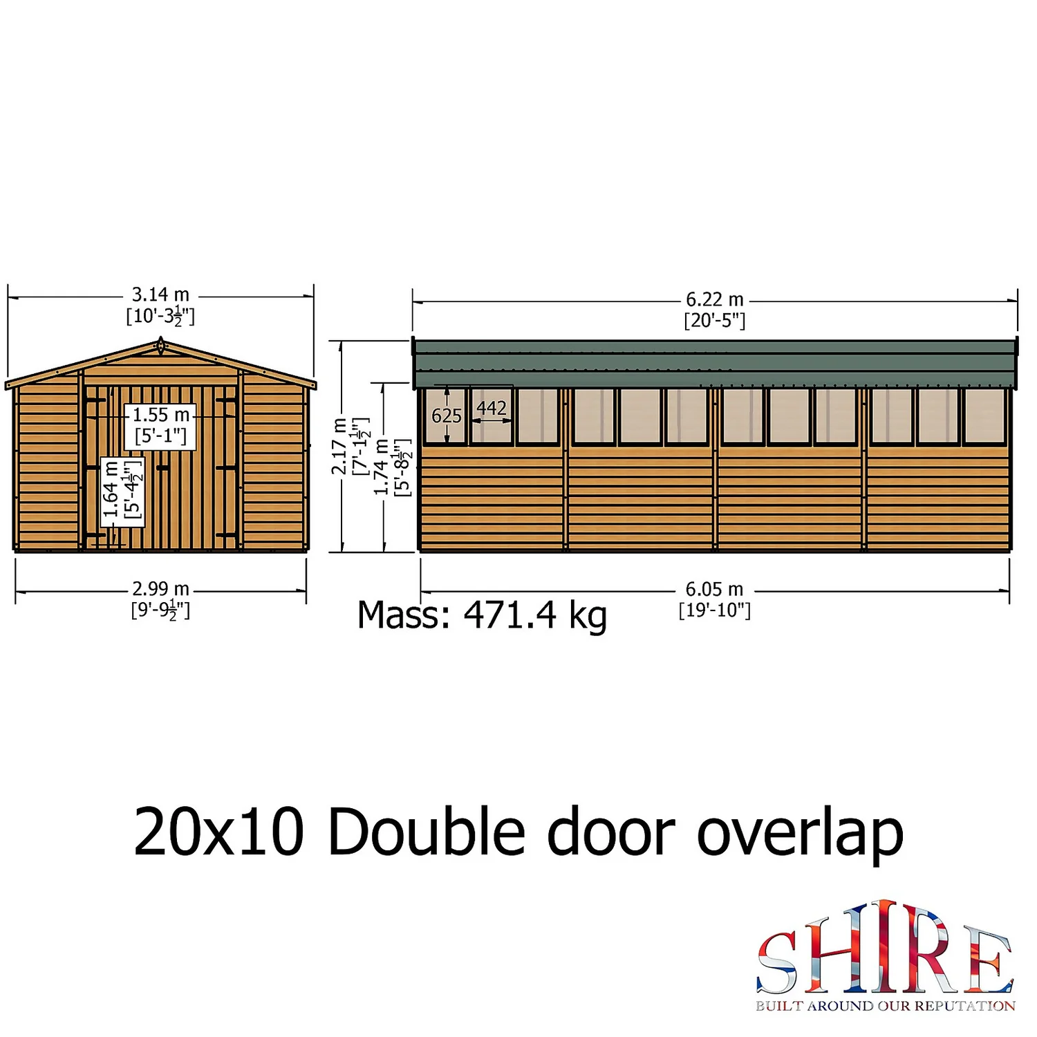 The 10′ x 20′ double door, overlap apex shed is an attractive feature in any garden. Windows down one side provide plenty of light and have safety glazing. Windows can be fitted on either side and are non-opening.